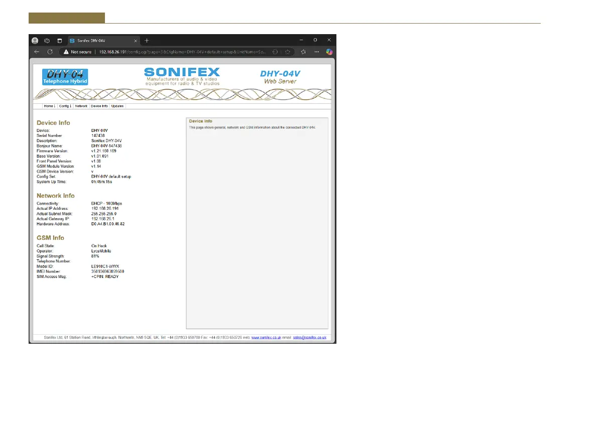 Figure 6-9: Device Info Page – shows info about the DHY-04V product