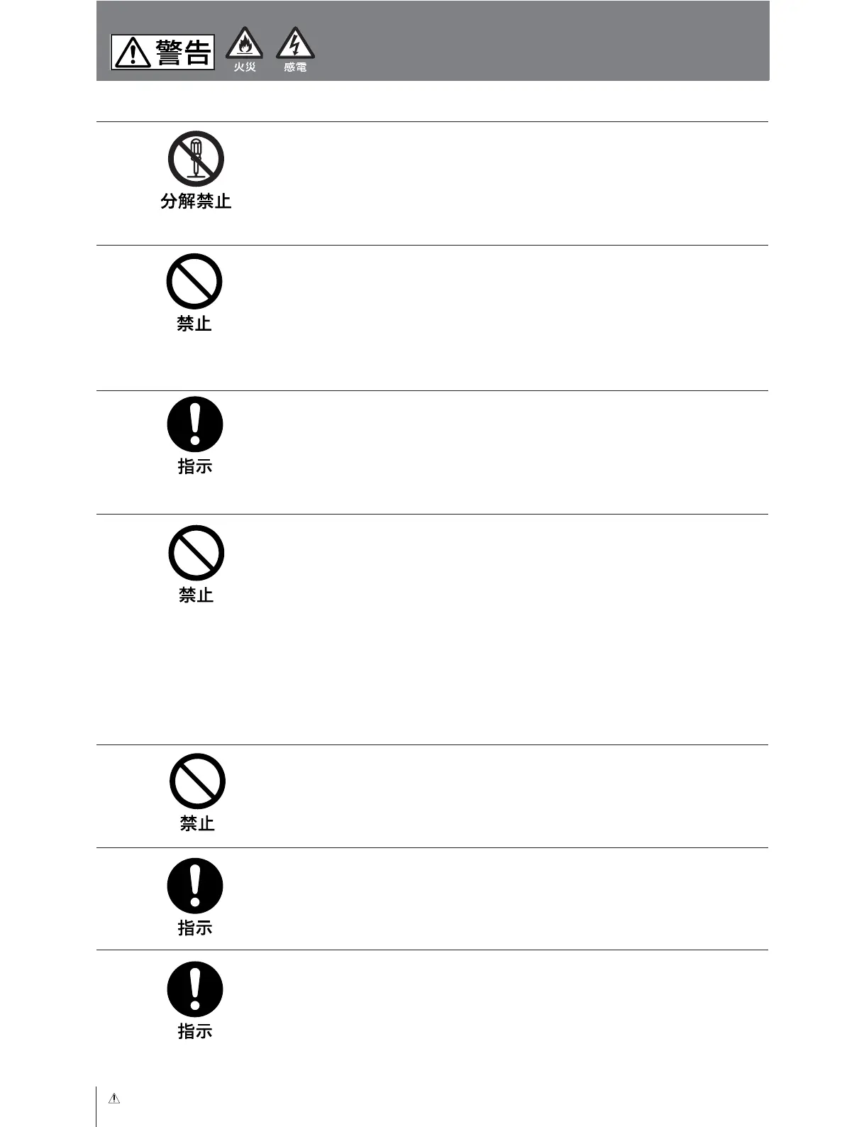 機器に表示されたものと異なる電源電圧で使用すると、火災や感電の原