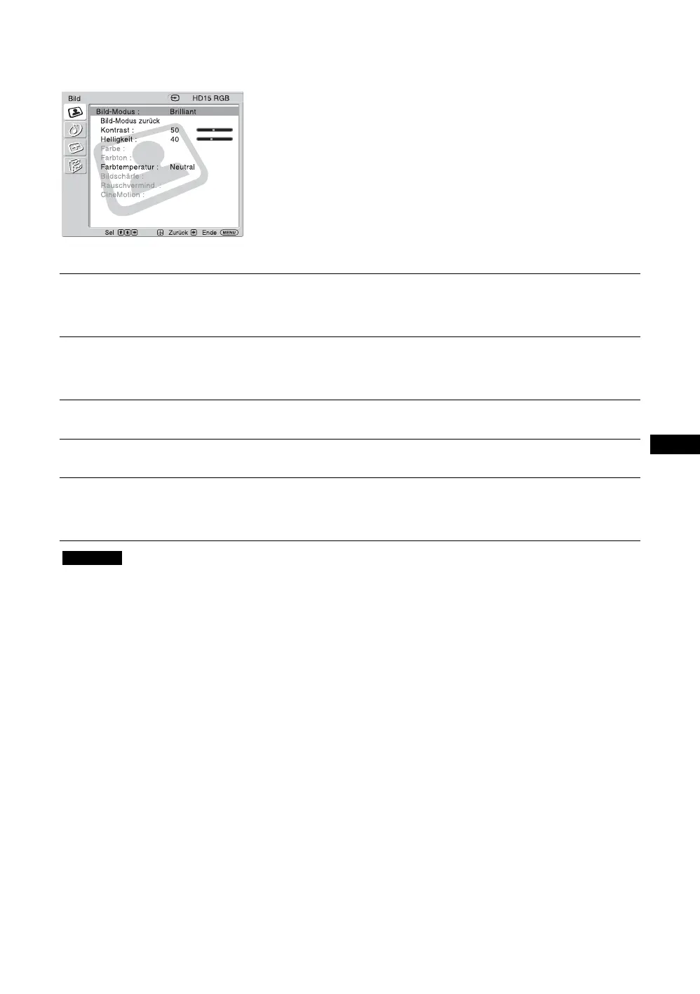 • „Farbe“, „Farbton“, „Bildschärfe“, „Rauschvermind.“ und „CineMotion“ stehen bei einem PC als Eingangsquelle nicht zur