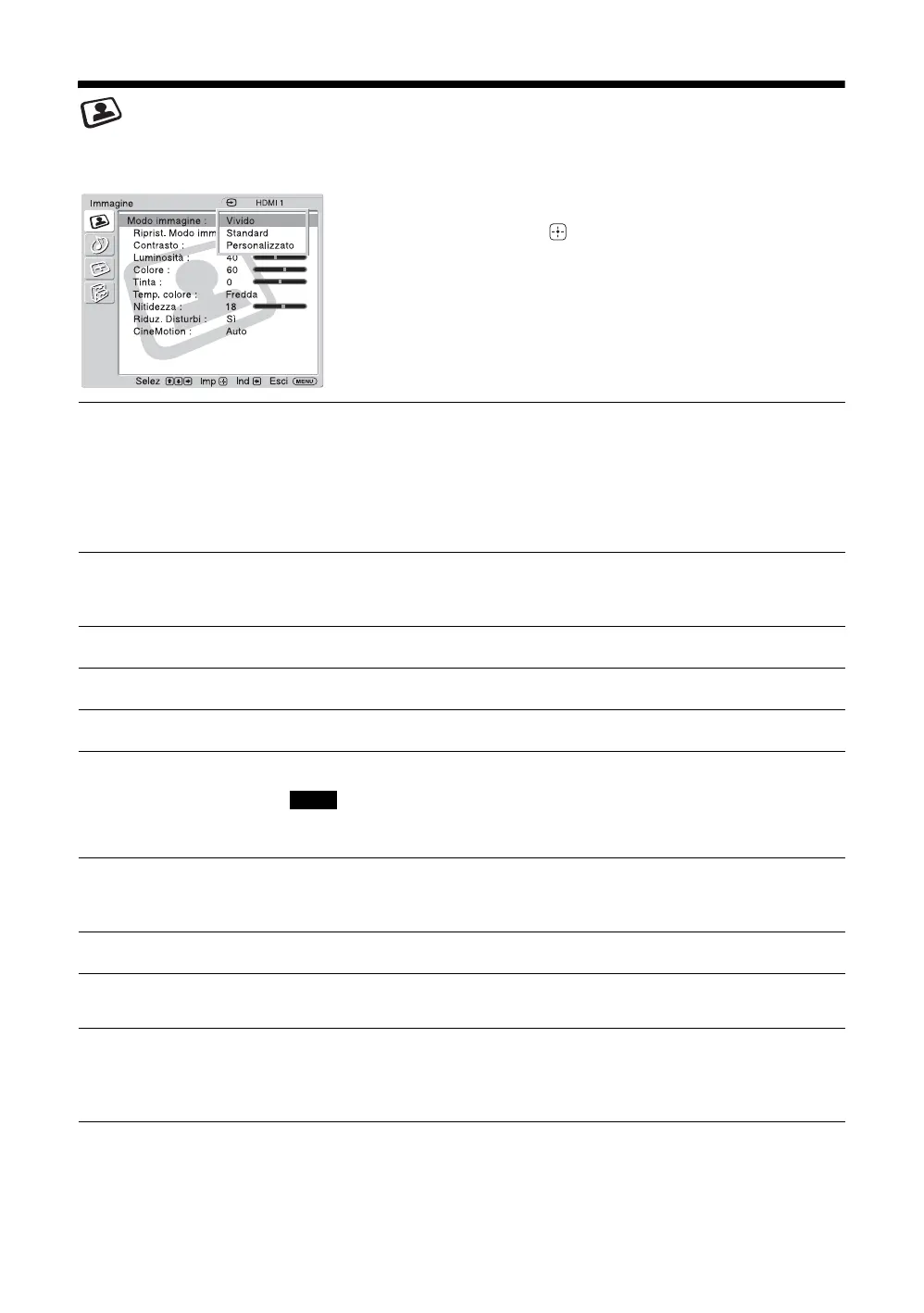 immagine” (“Vivido”, “Standard”, “Personalizzato”) sui valori predefiniti (ad
