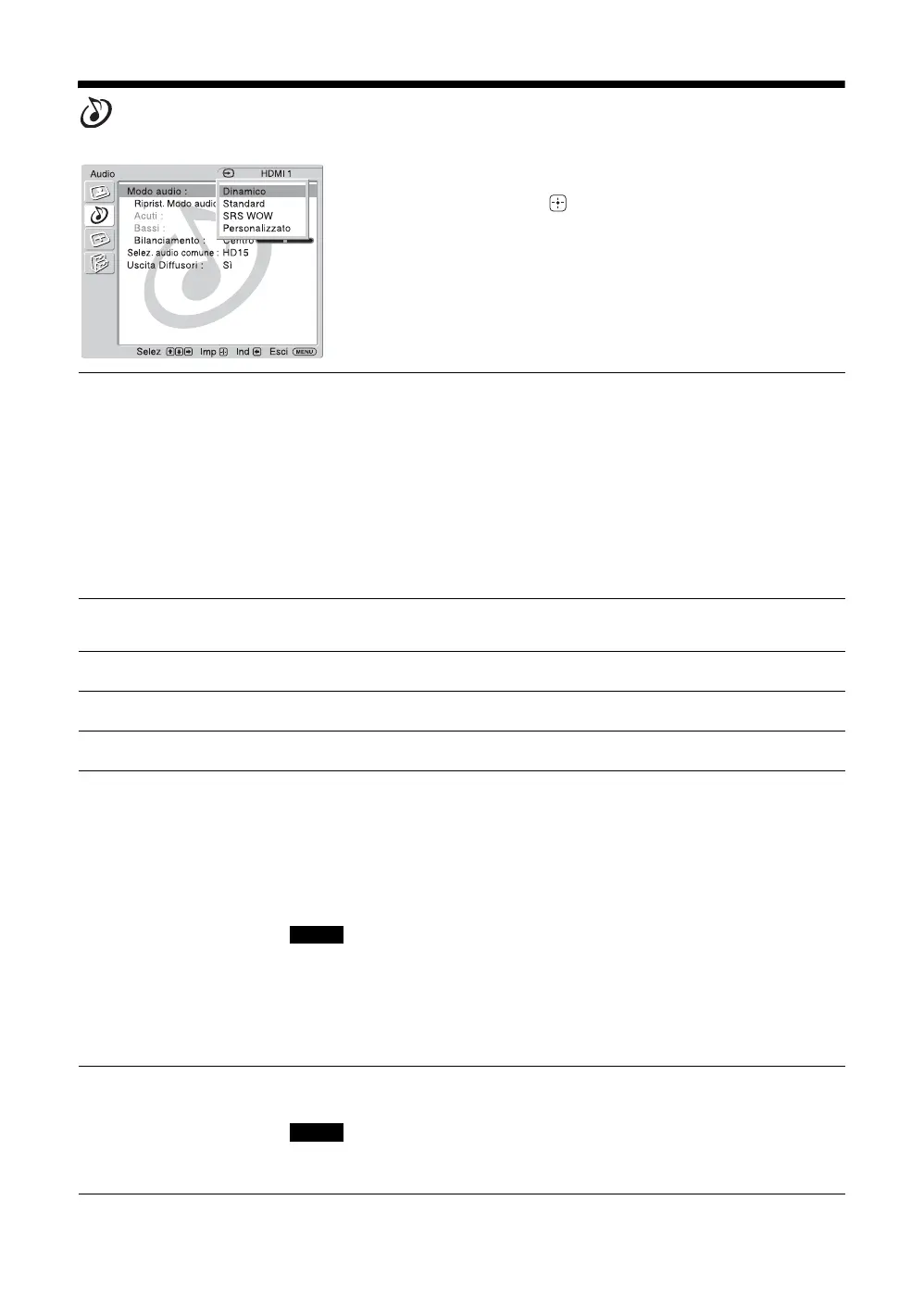 È possibile regolare le impostazioni del menu “Audio” (“Acuti” e “Bassi”) se “Modo audio” è impostato su “Personalizzato”.