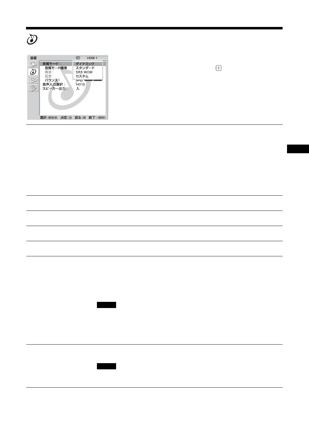 「スピーカー出力」が「切」のときは、「音質モード」、「音質モード標準」、「高音」、