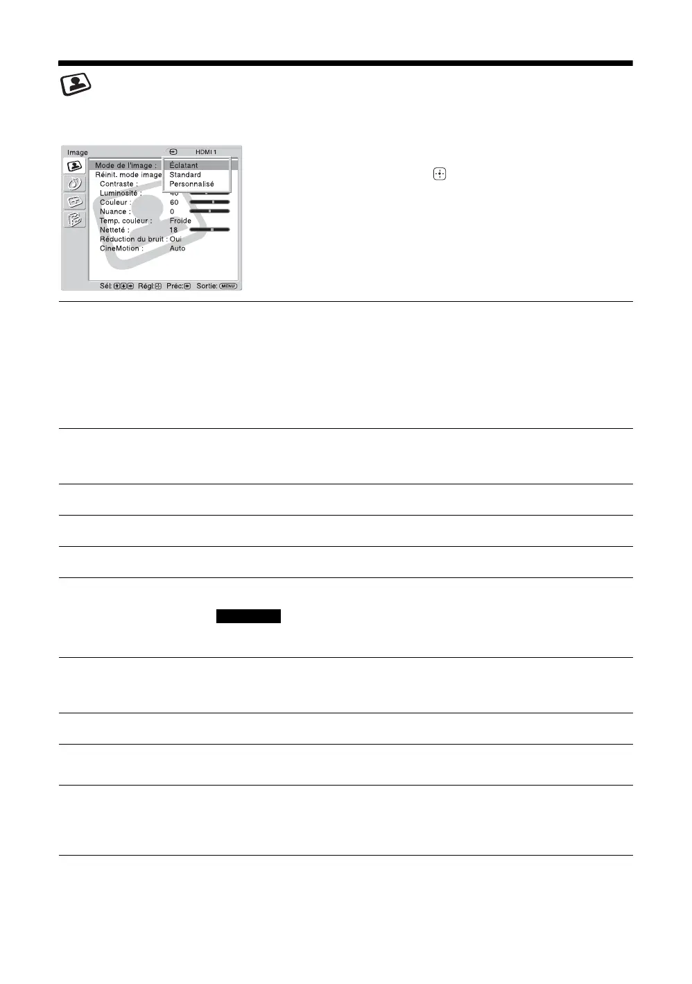 Vous pouvez modifier les réglages « Image » (« Contraste », « Luminosité », « Couleur », etc.) pour chaque « Mode de l'image ».
