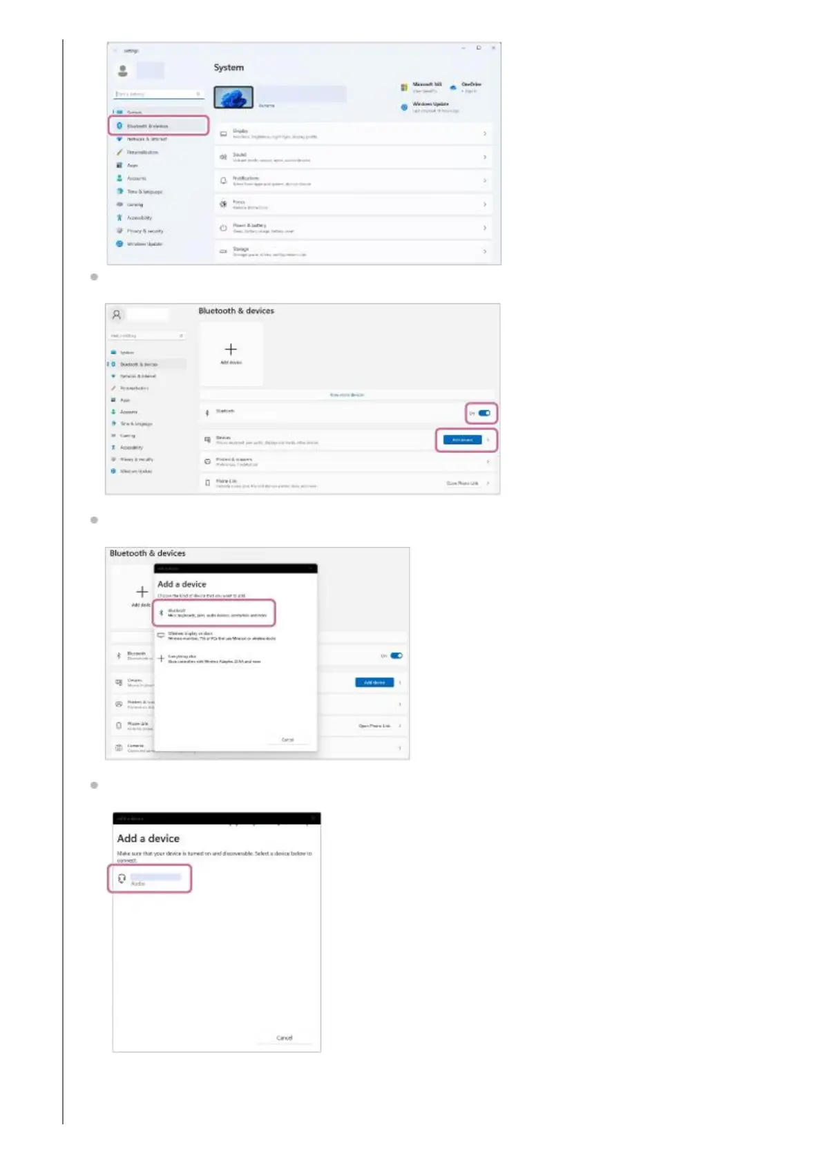 Click the [Bluetooth] switch to turn on the BLUETOOTH function, and then click [Add device].