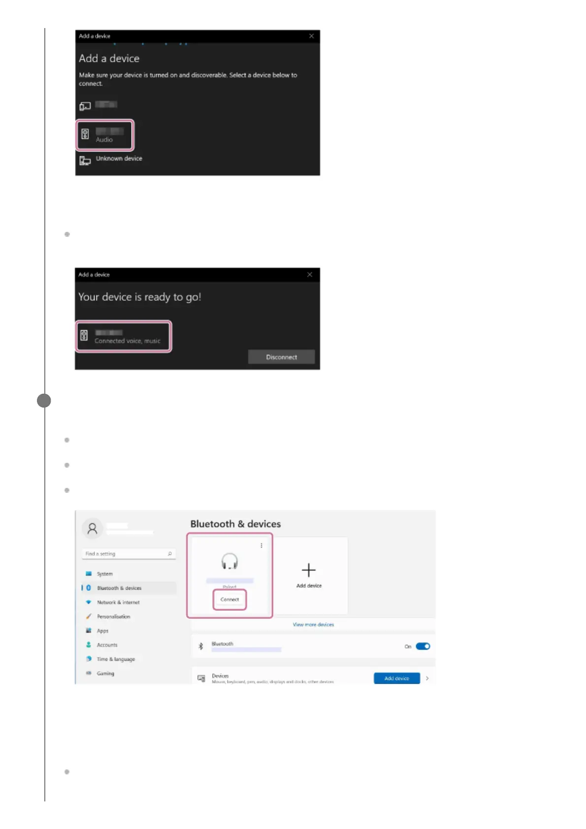 After pairing, the BLUETOOTH connection establishes automatically and [Connected music] or [Connected