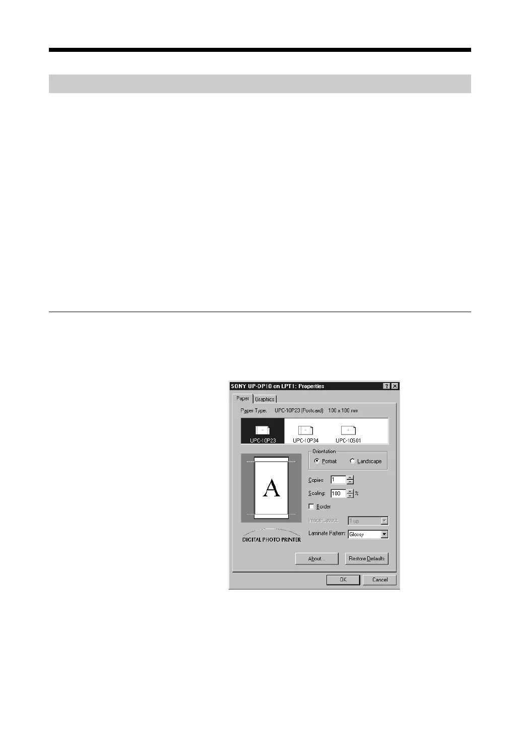 explains the tabs that are specific to the UP-DP10: [Paper] and [Graphics].