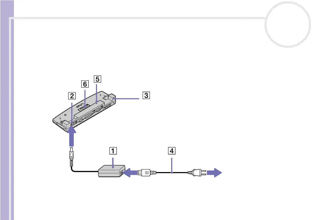 2 Plug the cable attached to the AC adapter (1) into the DC In port (2) on the port replicator (3).