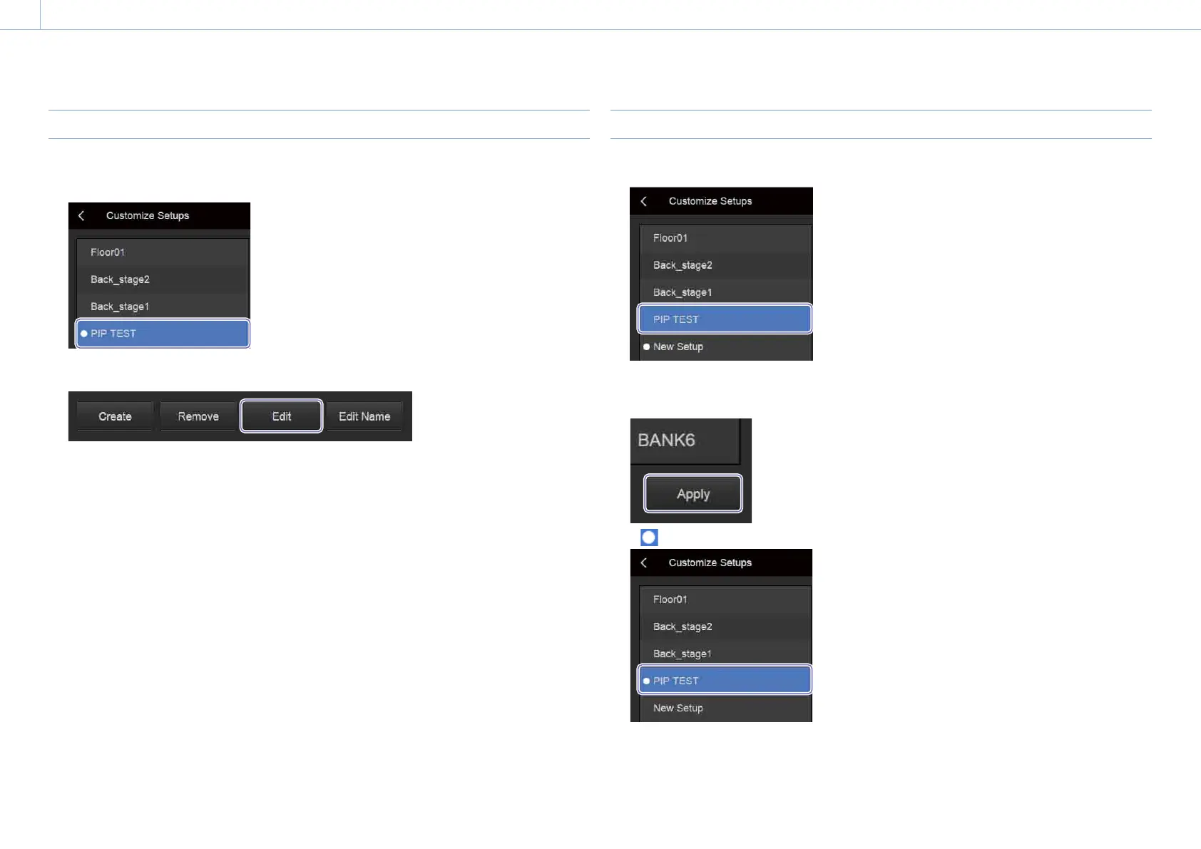 The background color of selected setup data changes to blue.
