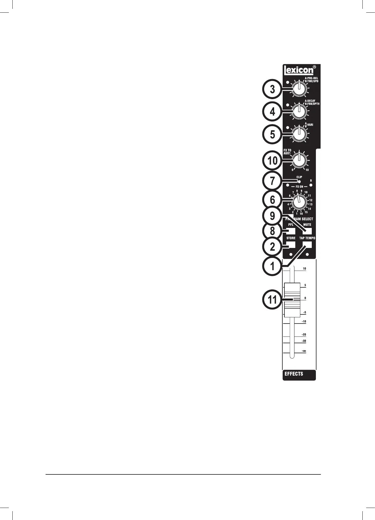 11. EFFECTS FADER - This fader controls the level of the signal, from the FX proces-