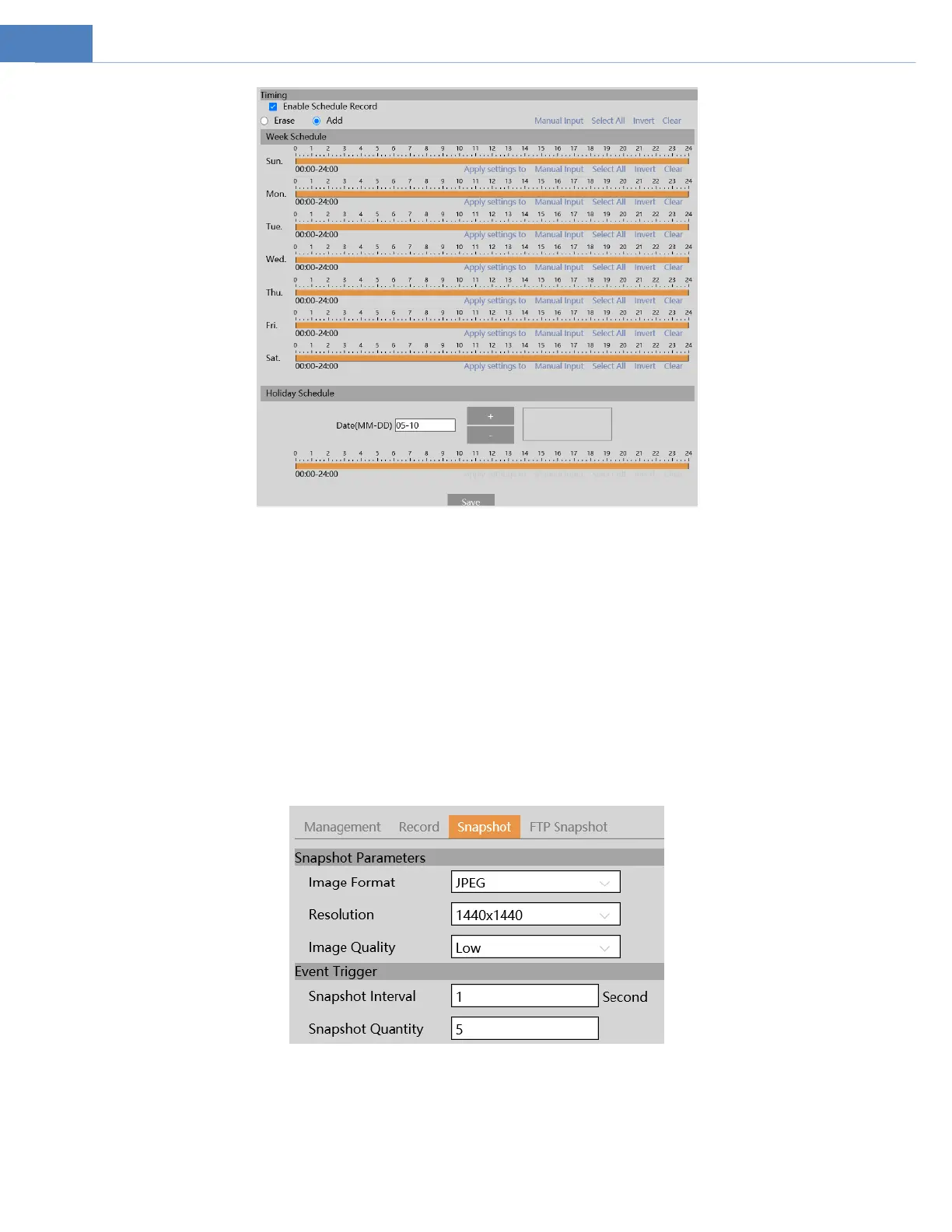 Set the format, resolution and quality of the image saved on the SD card and the snapshot interval and quantity and the timing