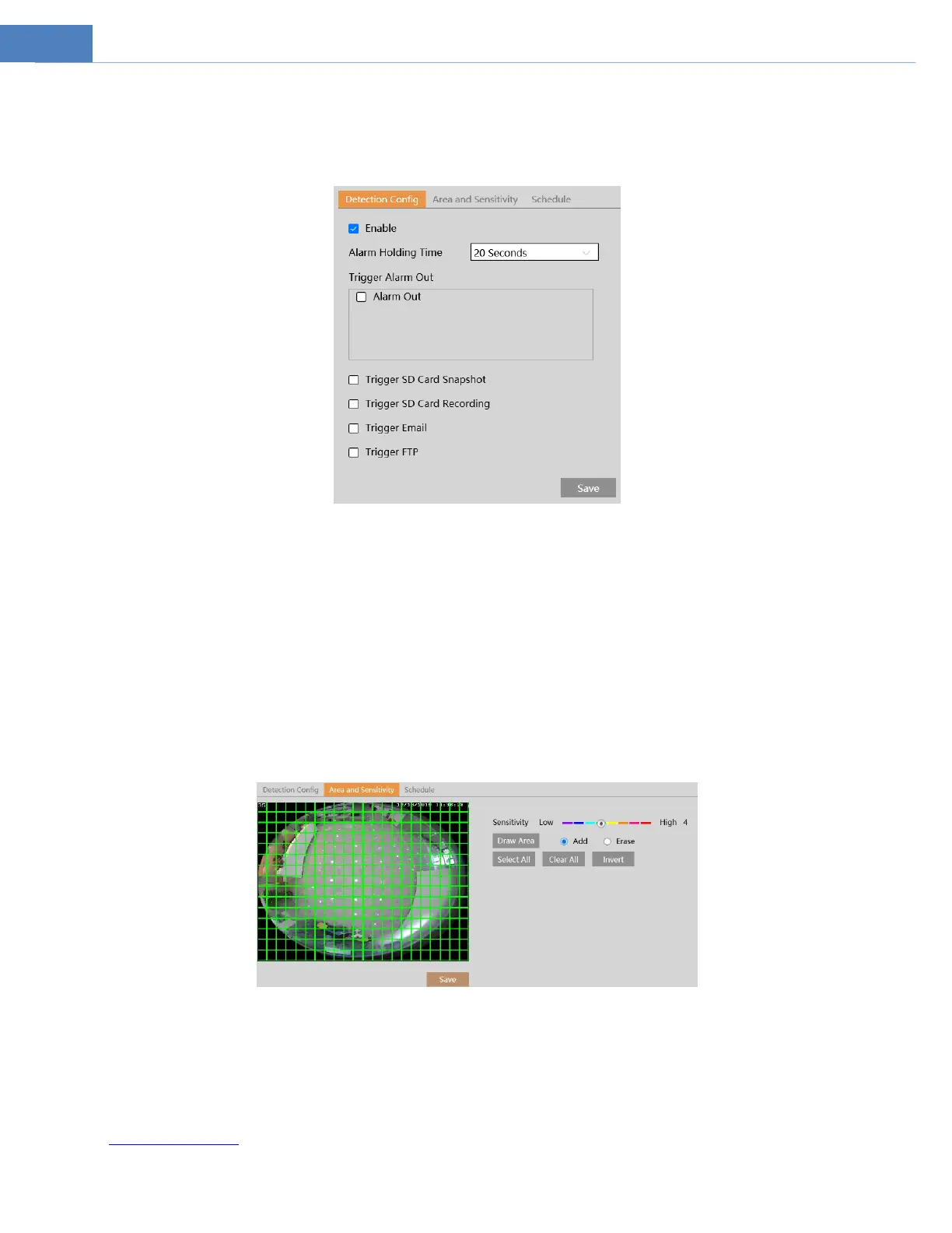 2. Set motion detection area and sensitivity. Click the “Area and Sensitivity” tab to go to the interface as shown below.
