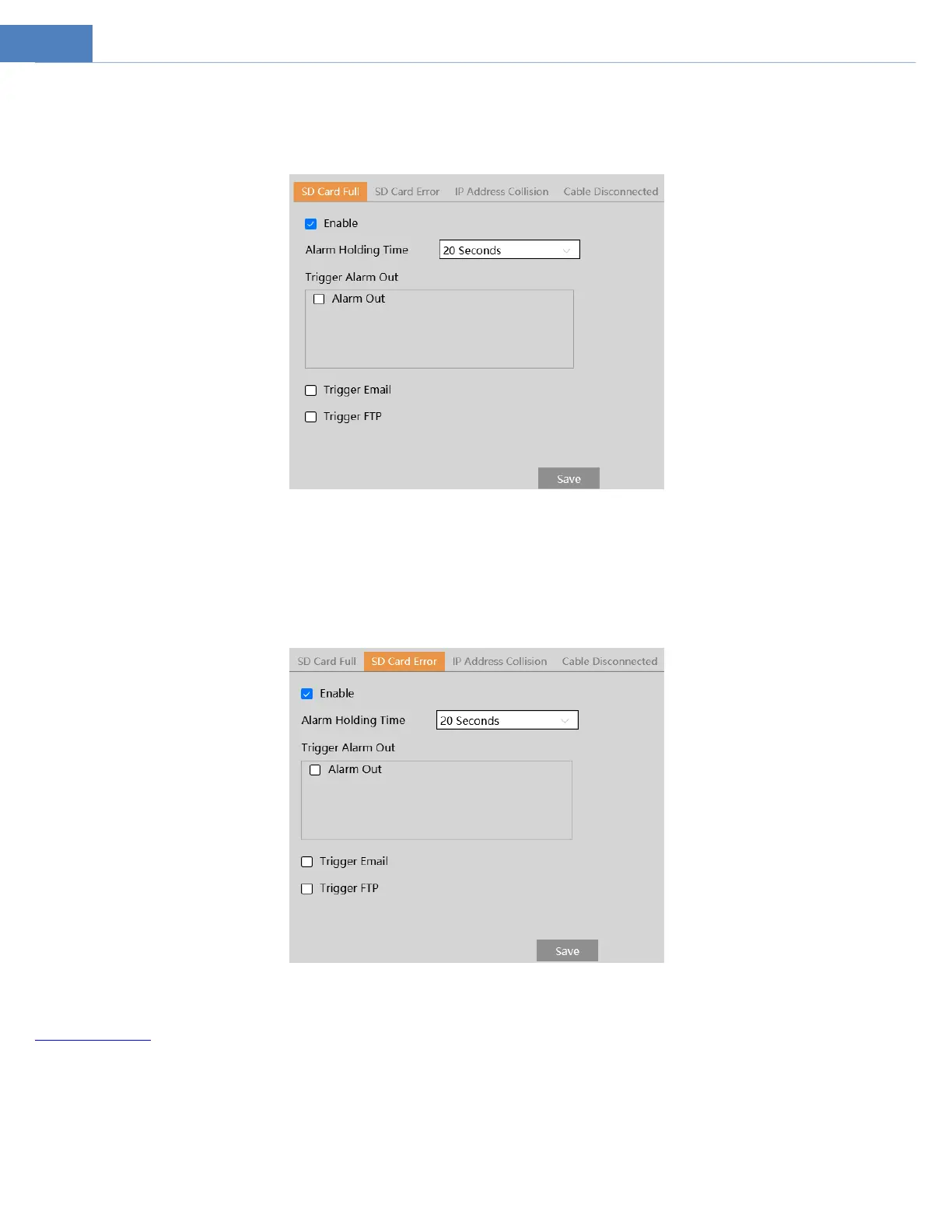 When there are some errors in writing SD card, the corresponding alarms will be triggered.