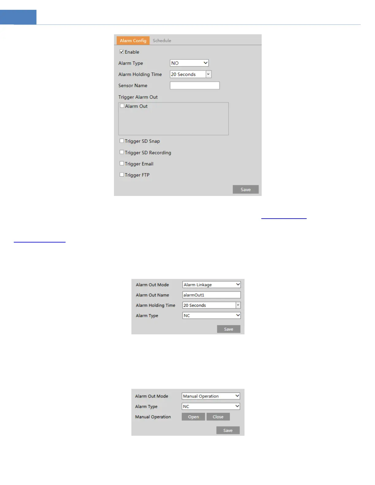 Manual Operation: Having selected this mode, select alarm type and click “Open” to trigger the alarm out immediately; click “Close”