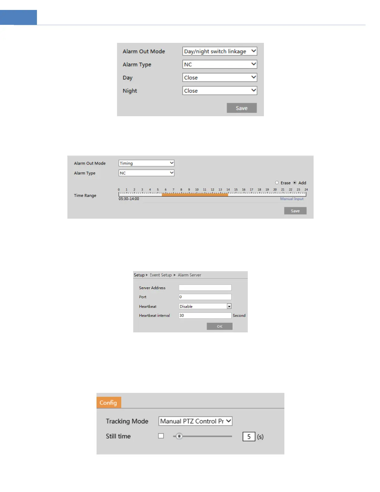 Set the server address, port, heartbeat and heartbeat interval. When an alarm occurs, the camera will transfer the alarm event to