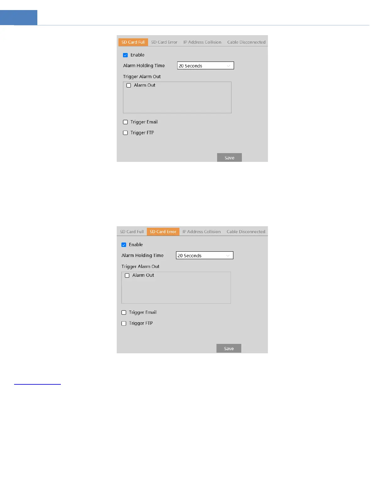 2. Click “Enable” and set the alarm holding time.