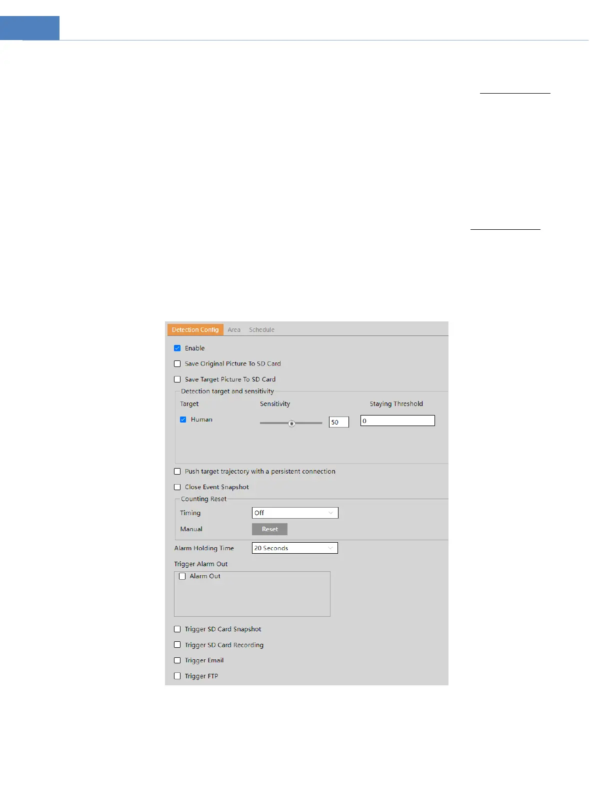 Staying Threshold: When the targets (human/vehicle) staying in the specified area exceed the threshold, alarms will be triggered.