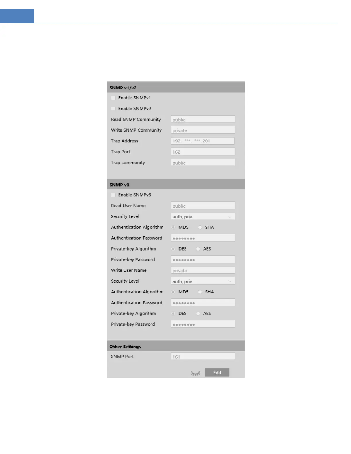 2. Click “Edit” and then check the corresponding version checkbox (Enable SNMPv1, Enable SNMPv2, Enable SNMPv3) according to
