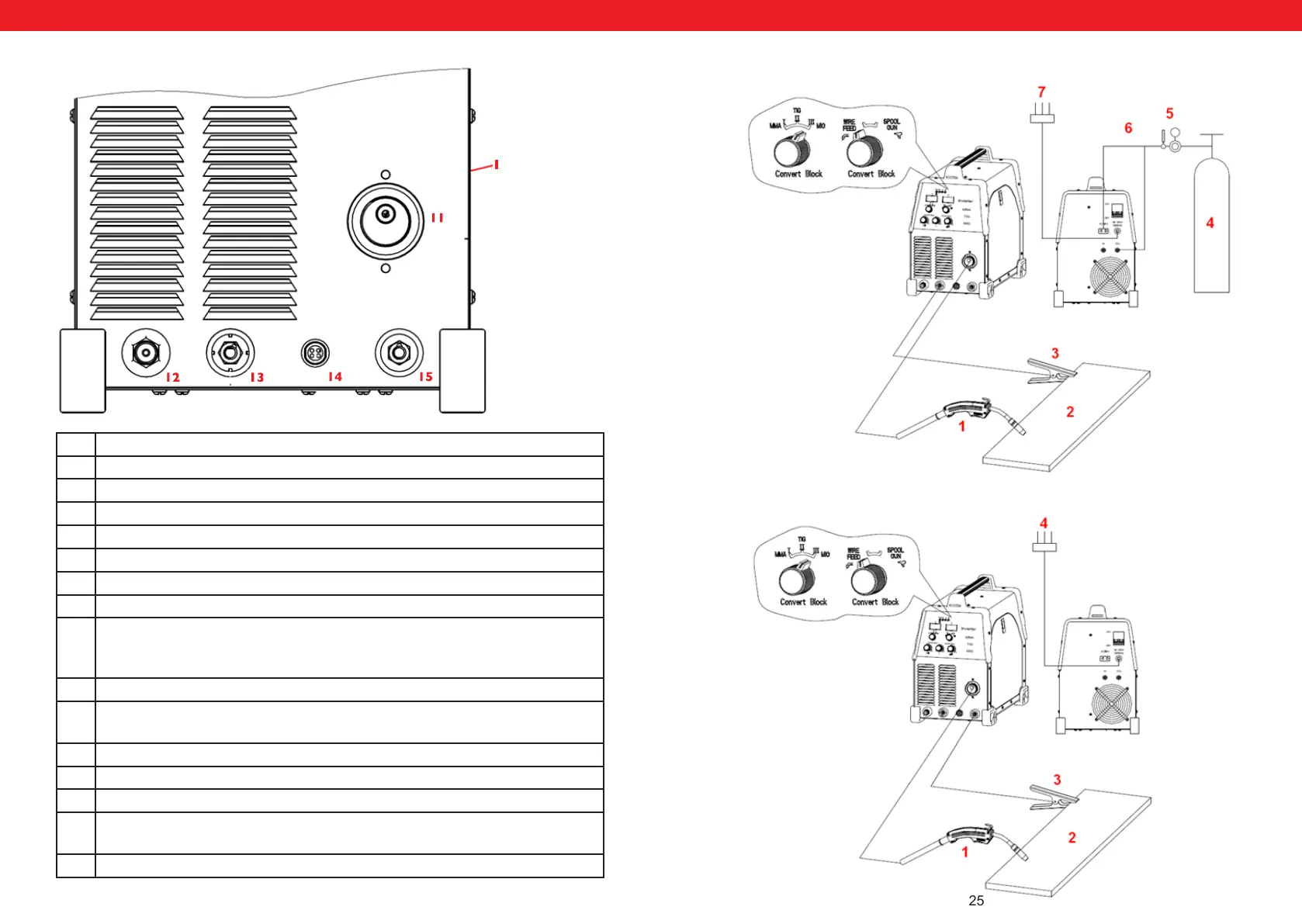 12. Integrated gas-electric output: connect with the TIG welding torch (polarity -)