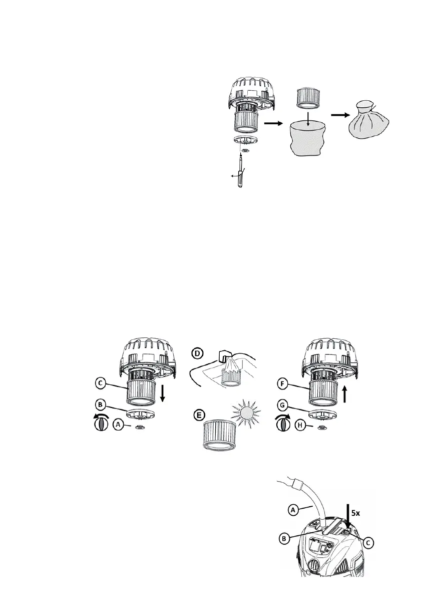 water (D). Let is dry (E) until completely dry. Install backwards by adding lter (F). Fixing the lter disc (G) and securing it with the knob (H).