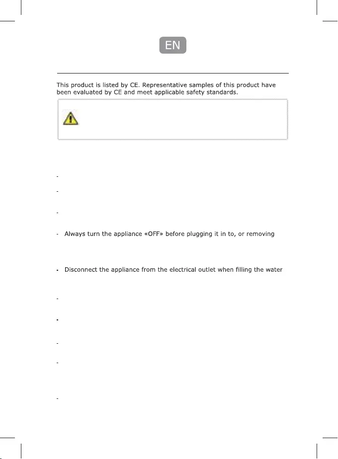 tank, emptying or when not in use. Fill only the water tank with water; do
