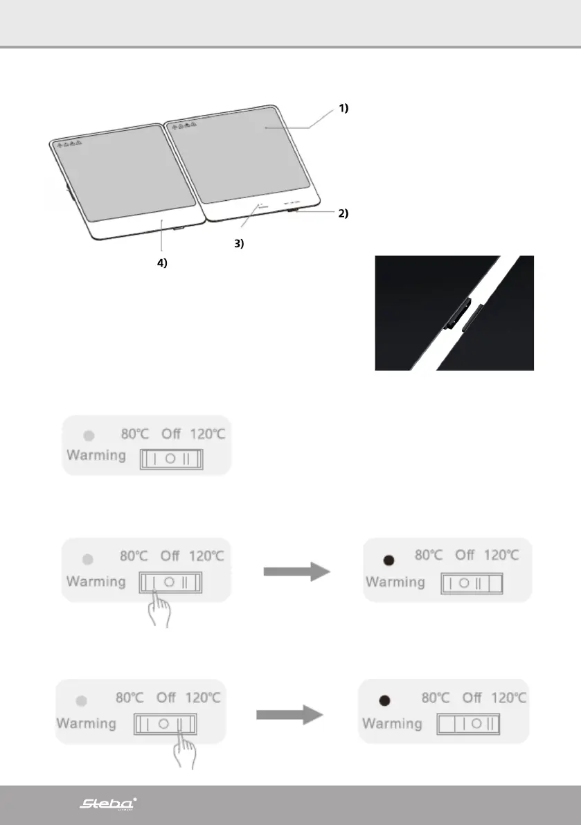 Wärmeleistung von ca. 120°C einzuschalten. Die LED auf der Glasplatte beginnt zu