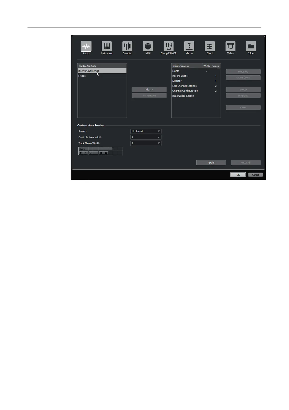controls. All controls can be removed except Mute and Solo.