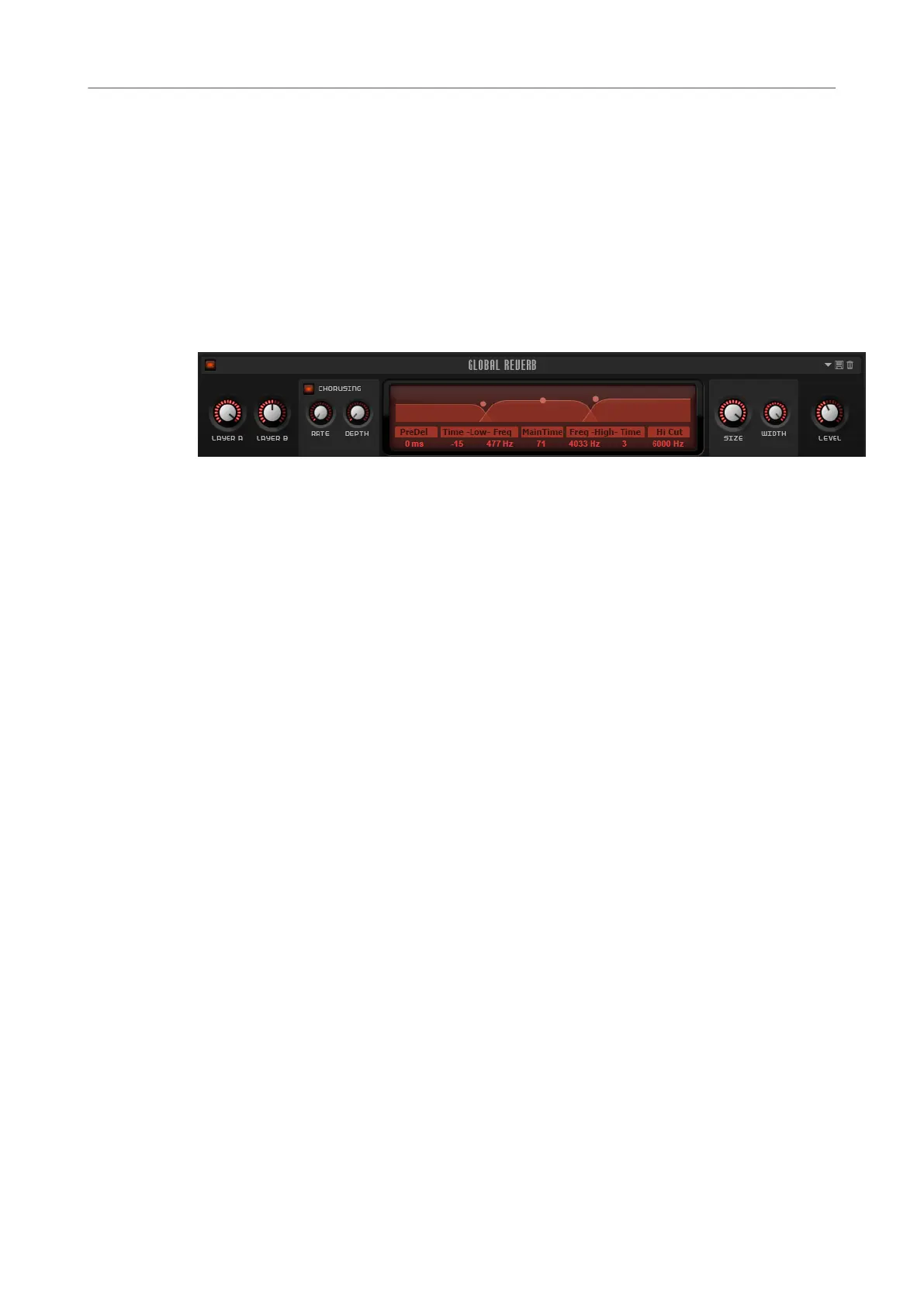 The reverb effect works as a global AUX effect. It can be fed by the two layers individually. This