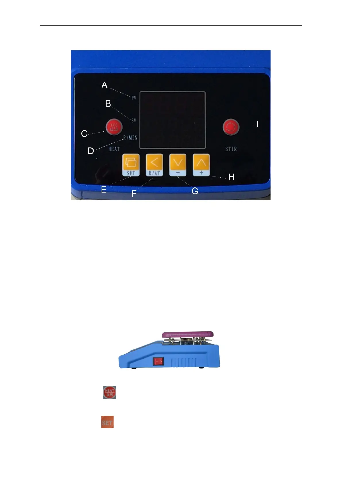 E. Set-Taste: zum Einstellen von Temperaturwert und Rührgeschwindigkeit
