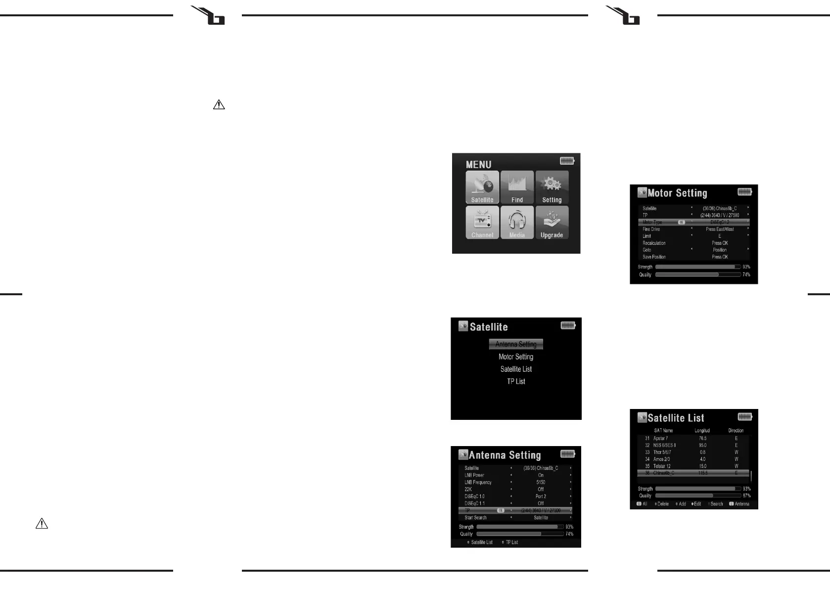 Jednotlivé volby „Statellite“ / „Find“ / „Setting“ / „Channel“/