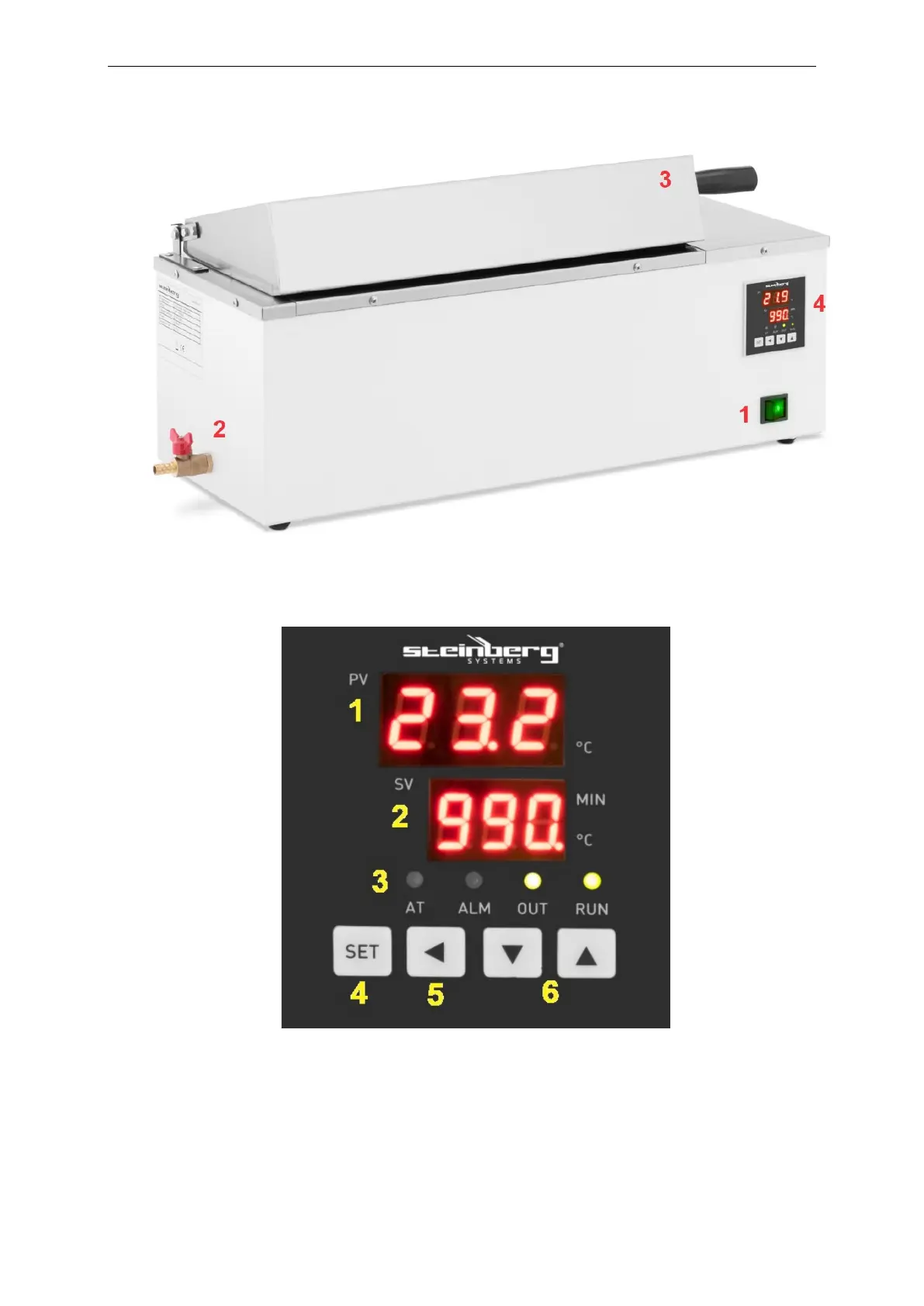 3 - Indicateurs RUN (unité en fonctionnement) / OUT (le chauffage est allumé) / AT (fonction AUTO) / ALM