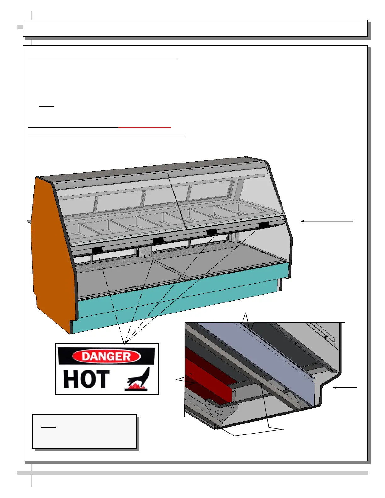 INSTALLATION, CONT’D: IMPORTANT! HEATED SHELF “DANGER - HOT” LABEL PLACEMENT
