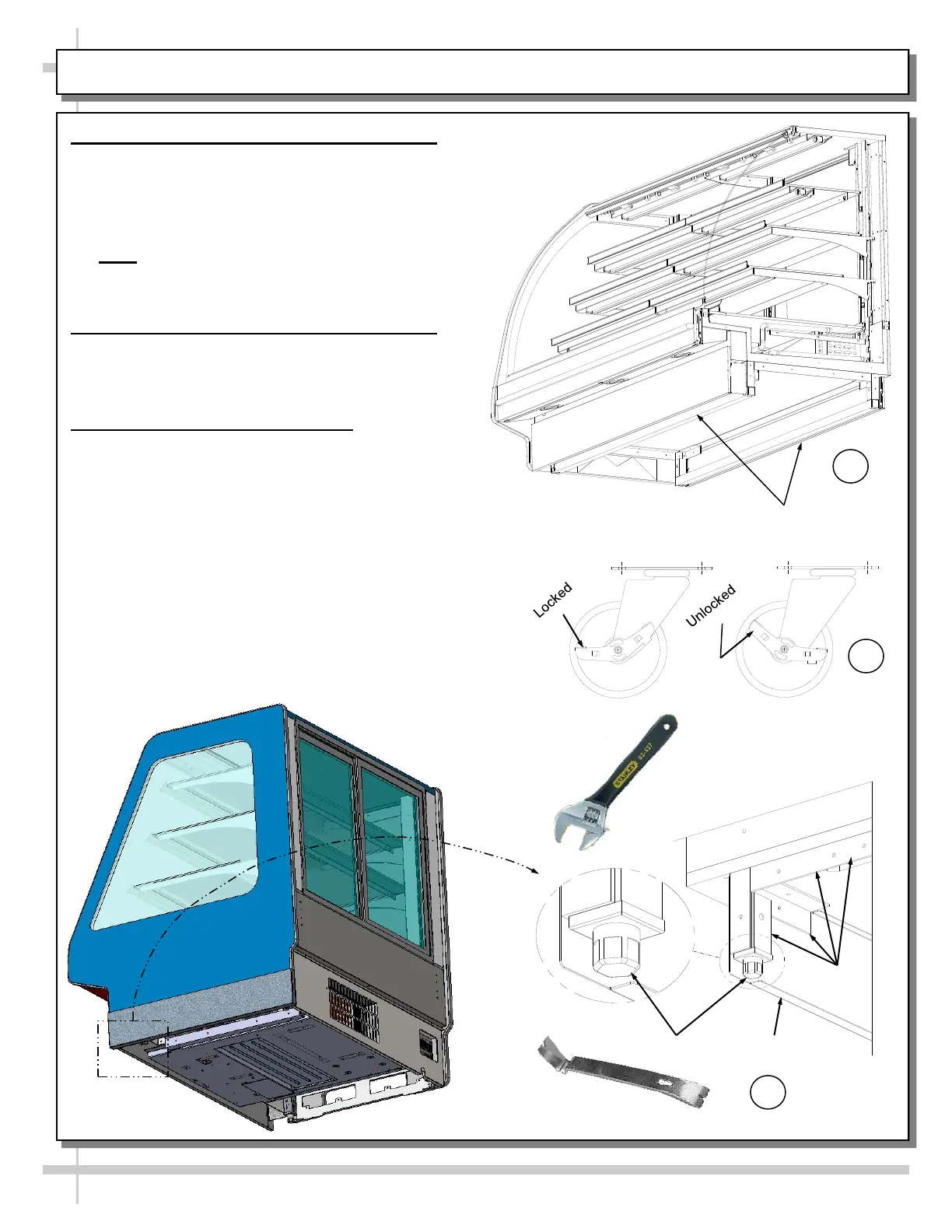 INSTALLATION: FRAME SUPPORT RAILS / SEALING TO FLOOR / LOCKING CASTERS / LEVELERS