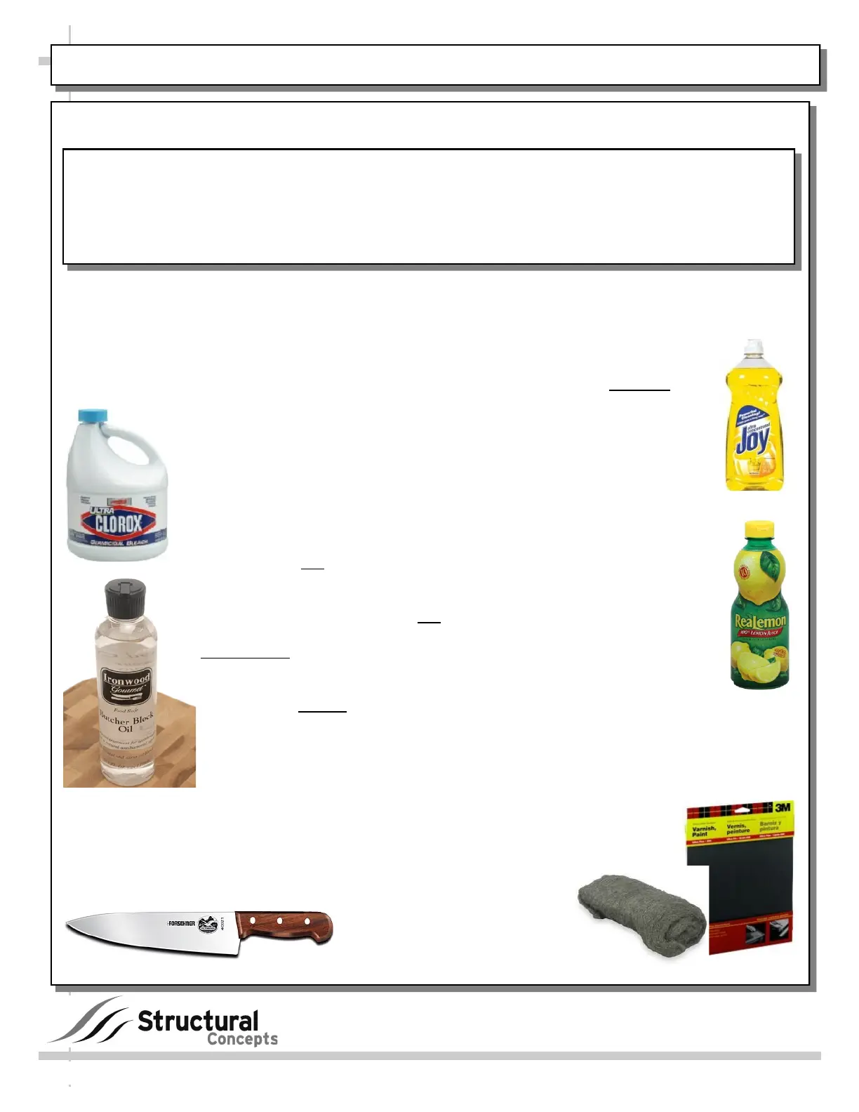 the surface until stains disappear. Then, coat the surface with mineral oil (see