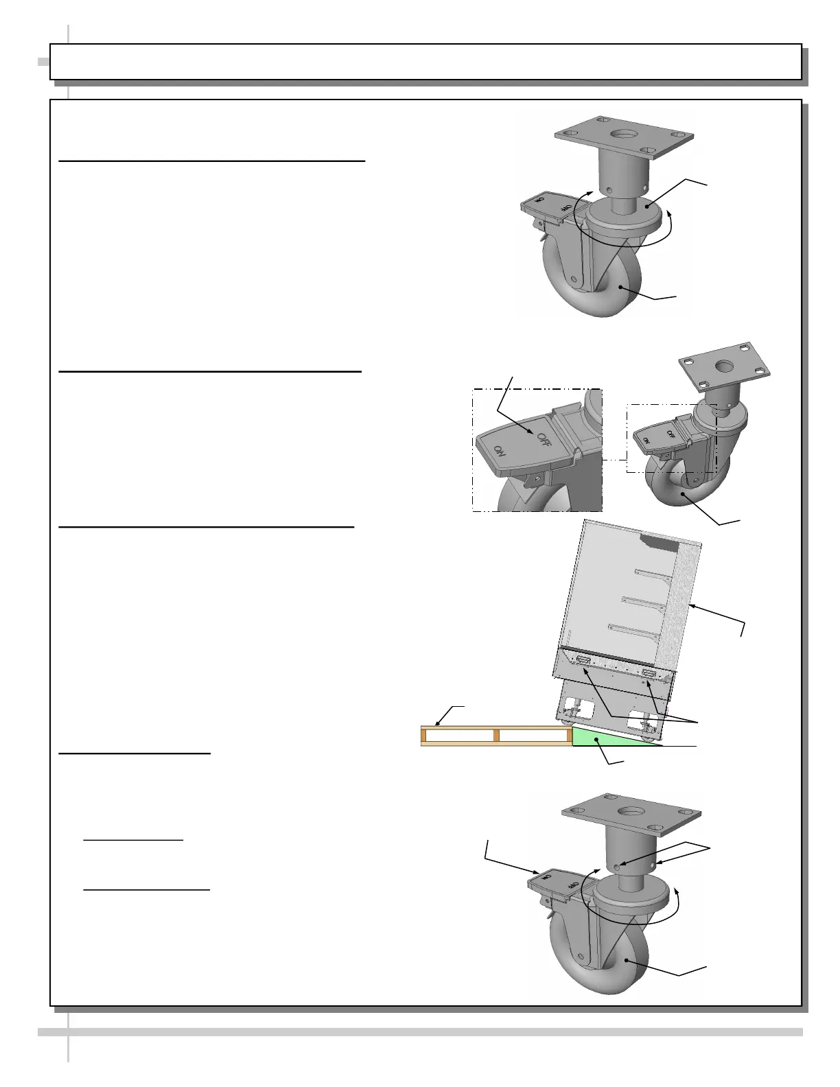INSTALLATION, CONT’D.: CASTER ADJUSTMENT / LOCK / UNLOCK / CASE REMOVAL FROM PALLET