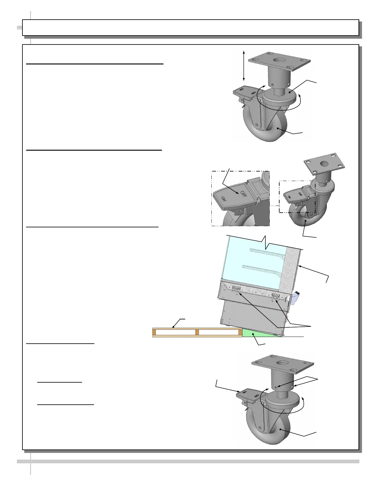 INSTALLATION, CONT’D.: CASTER ADJUSTMENT / LOCK / UNLOCK / CASE REMOVAL FROM PALLET