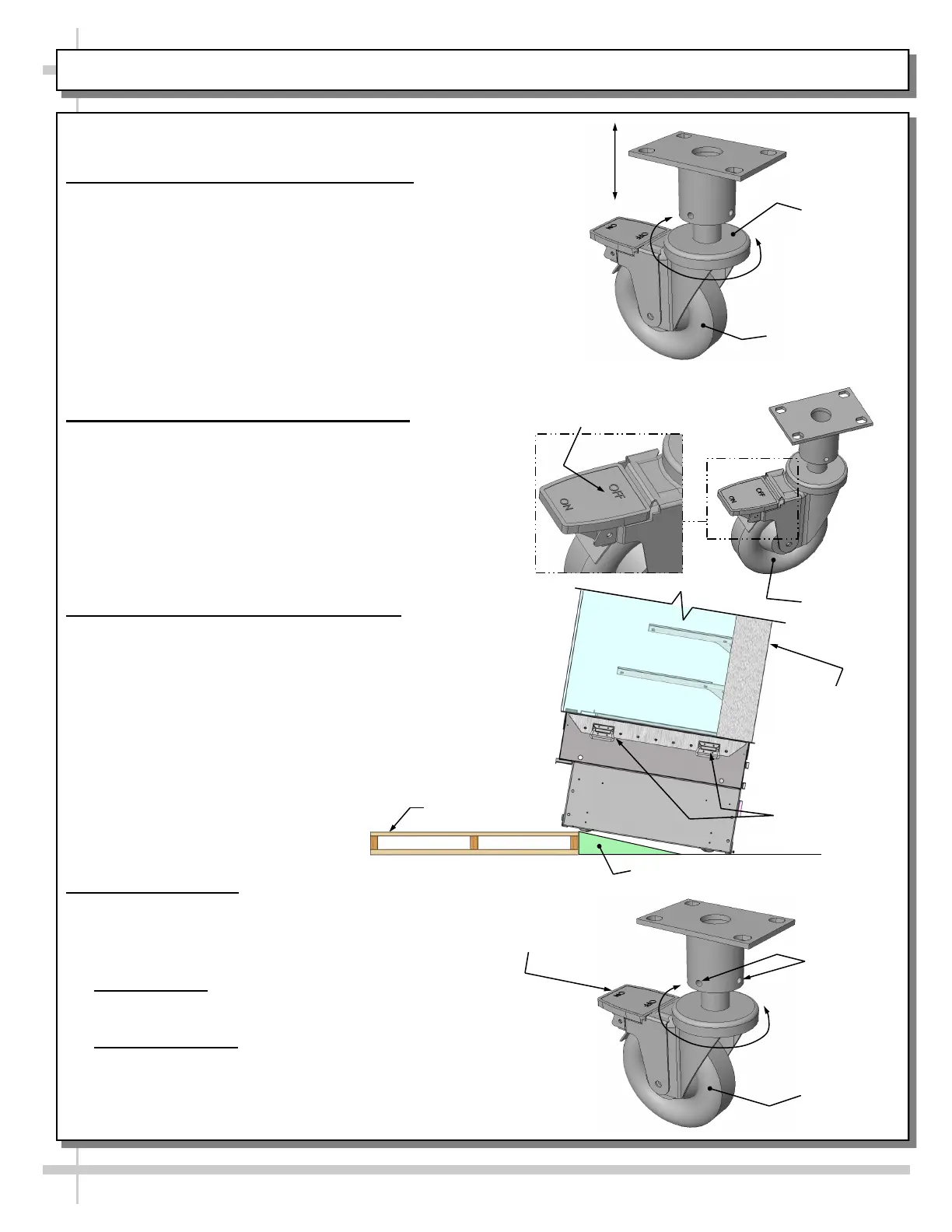INSTALLATION, CONT’D.: CASTER ADJUSTMENT / LOCK / UNLOCK / CASE REMOVAL FROM PALLET