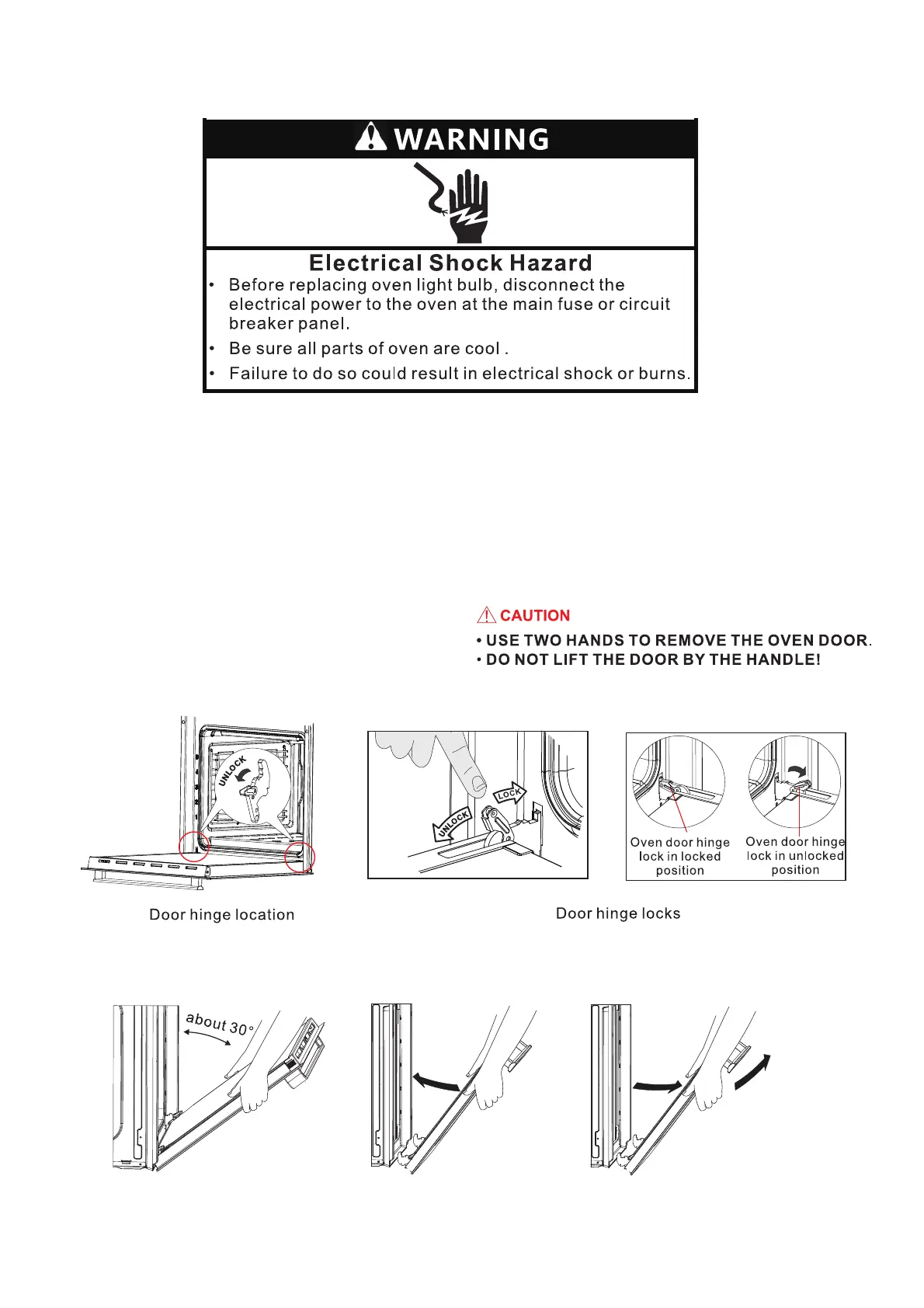 2.Using two hands grasping two sides of oven door on 30°, lift the oven door out and toward you.