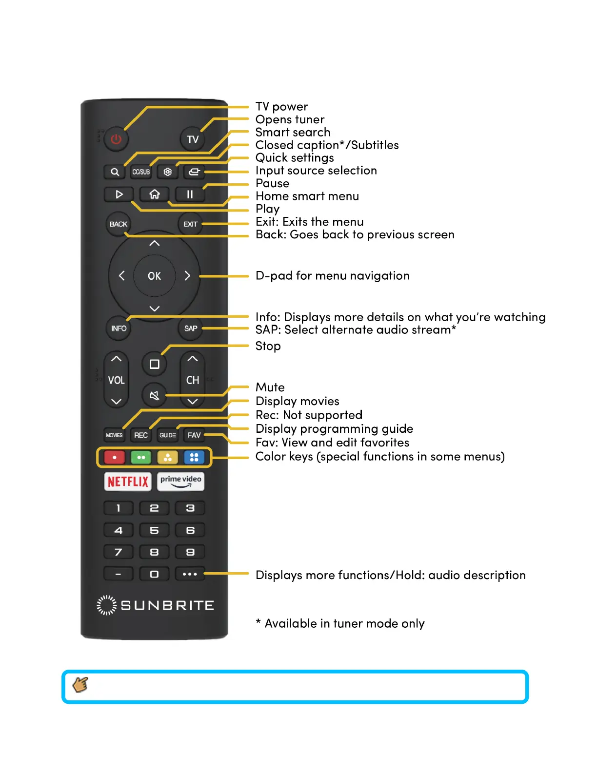 Note: Th e Su n Br it e Ou t d o o r Re m o t e u se s IR o n ly . It d o e s n o t su p p o r t v o ic e c o n t r o l.
