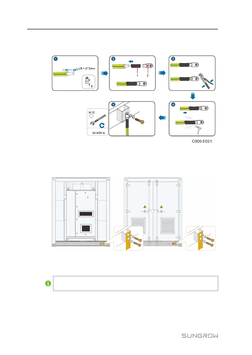 • Connect the grounding cable to the external grounding points with M10 bolts, where the