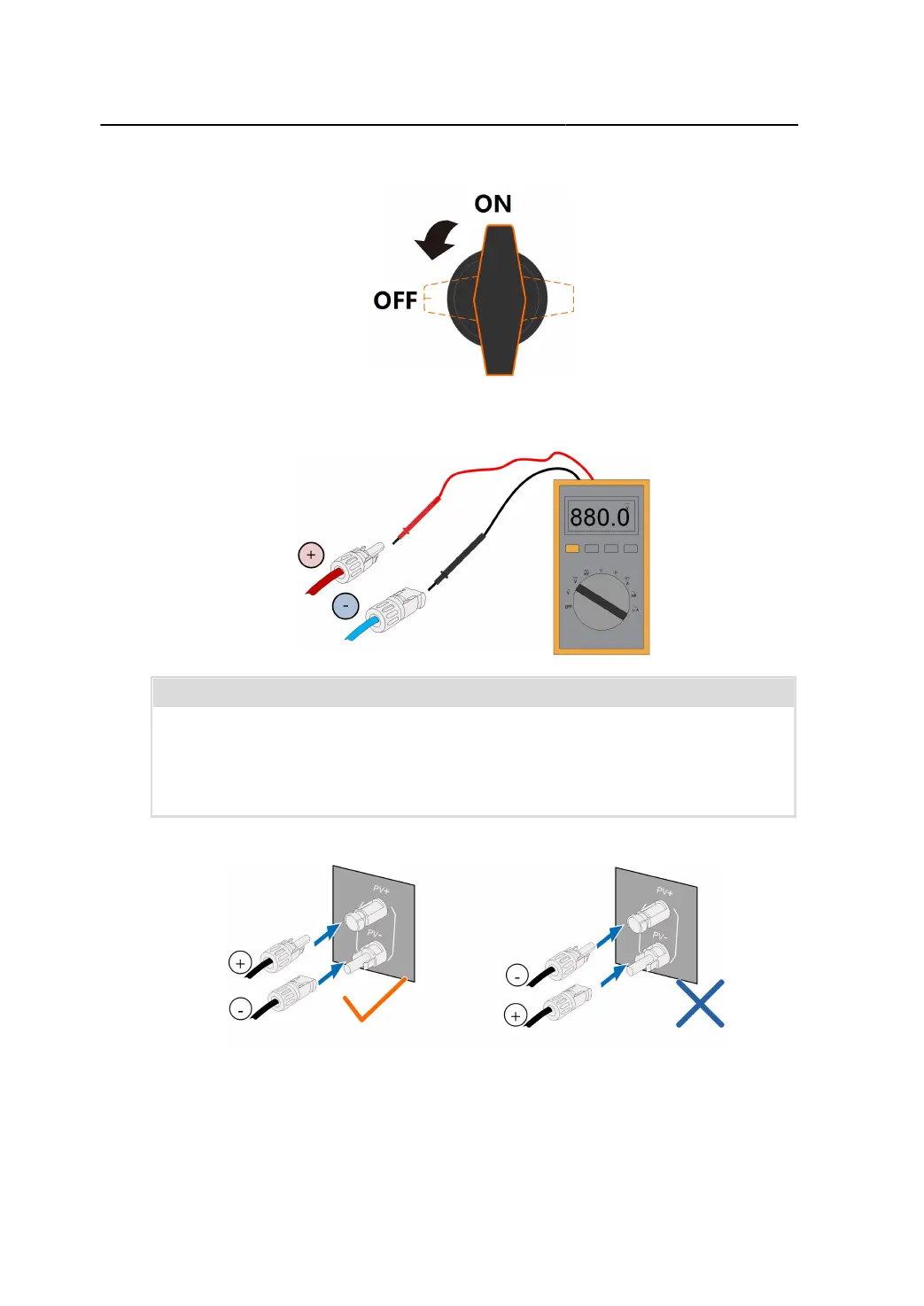 The multimeter must have a DC voltage range of at least 1,500 V. If the voltage is a negative