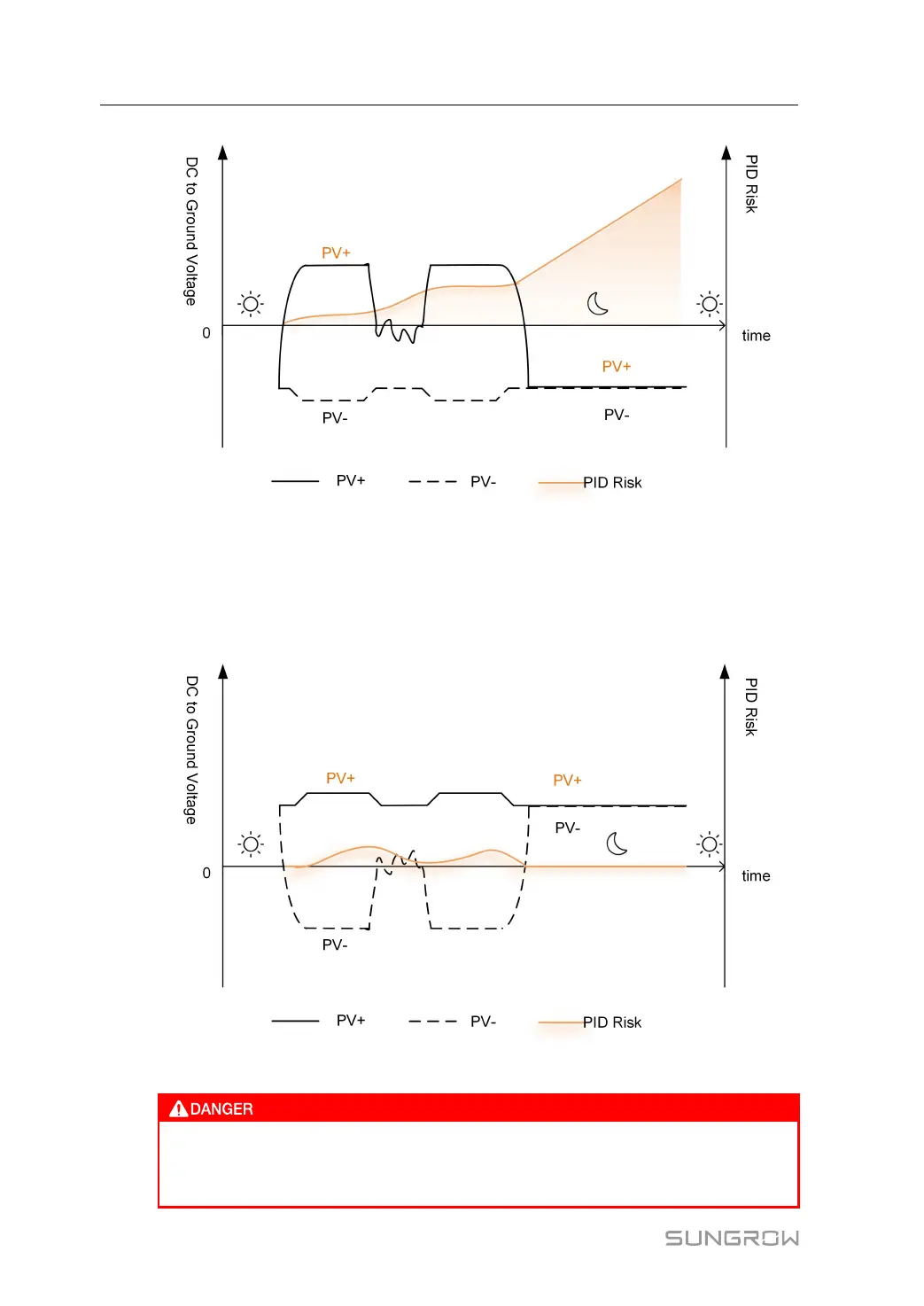 The following figure is the PID risk of the inverter equipped with PID Zero, it prevents the PV