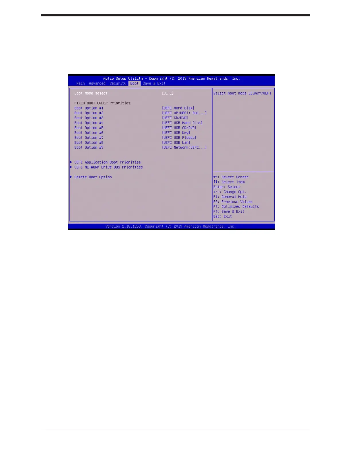 Use this feature to select the boot mode. The options are LEGACY, UEFI, and DUAL.