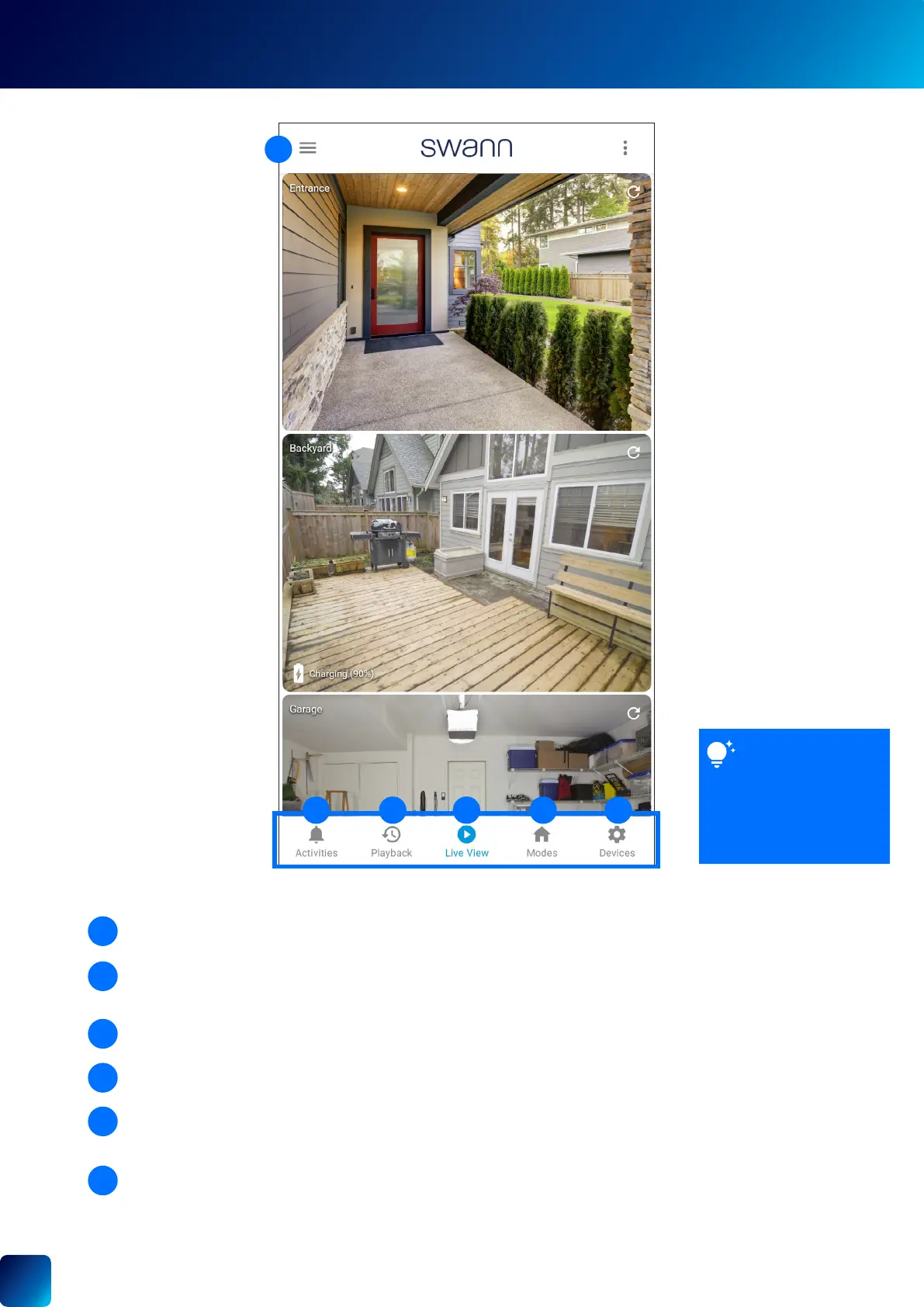 Live View Tab: Tap to view live video feed from all your connected devices in multi-view screen as well as in single-view