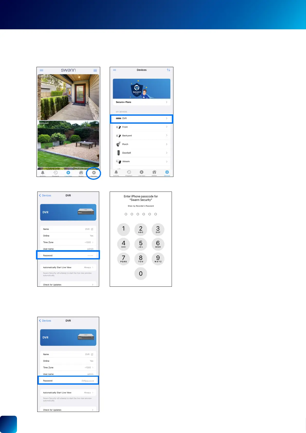 You can easily nd the password for any DVR/NVR associated with your Swann Security account. This can be