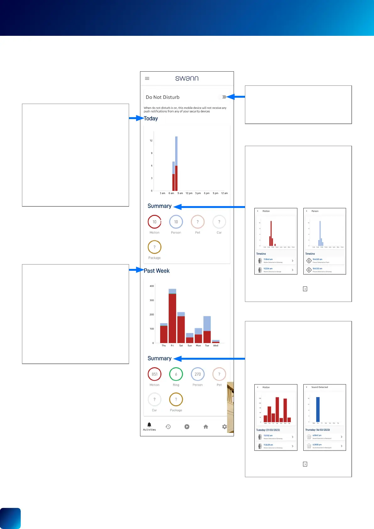 The Activities screen provides a consolidated view of all the detection alerts generated today and the past week by your Swann