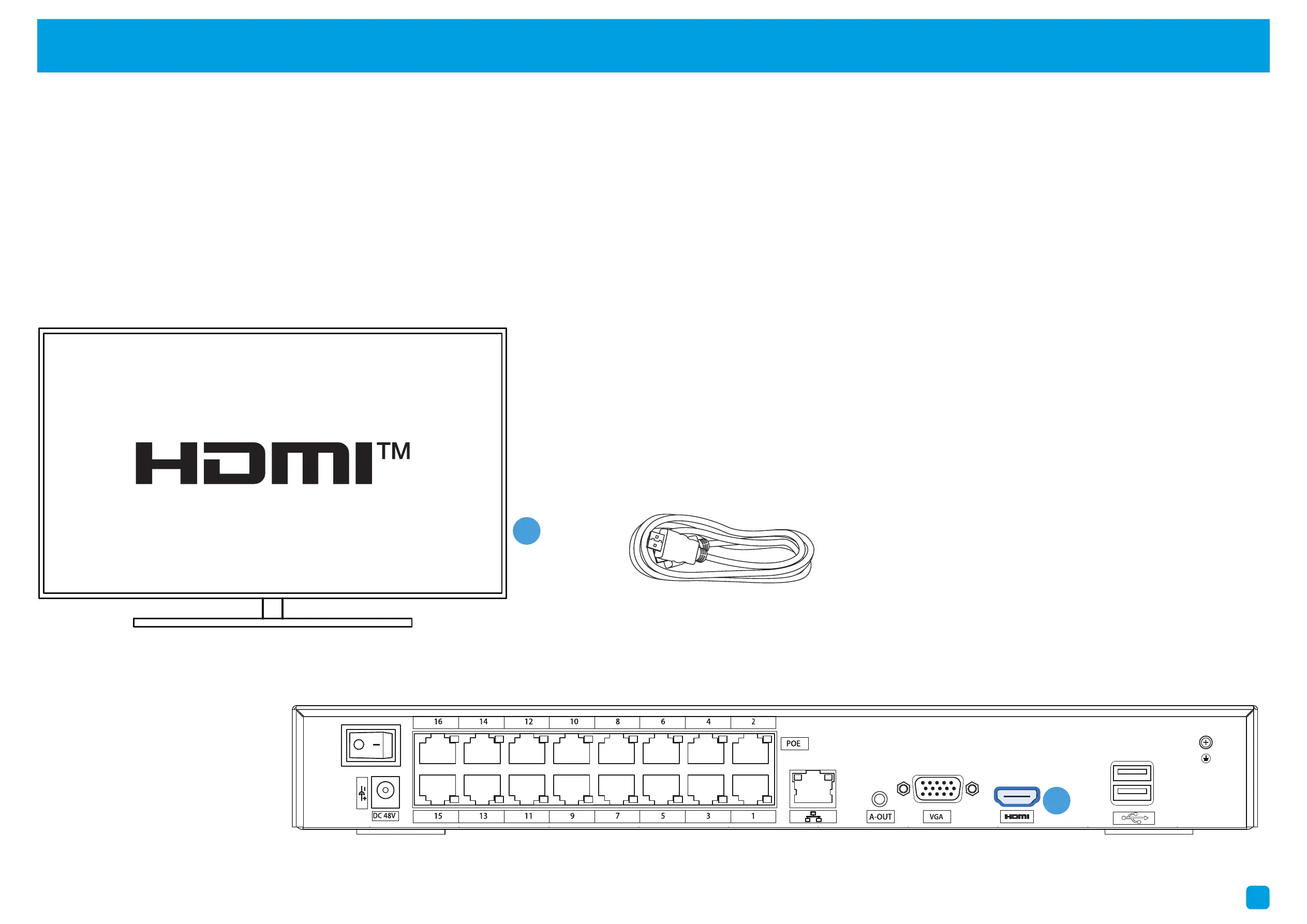Connect to your TV: Connect the HDMI cable to the HDMI port (A) on the NVR, then connect the other end to a spare HDMI