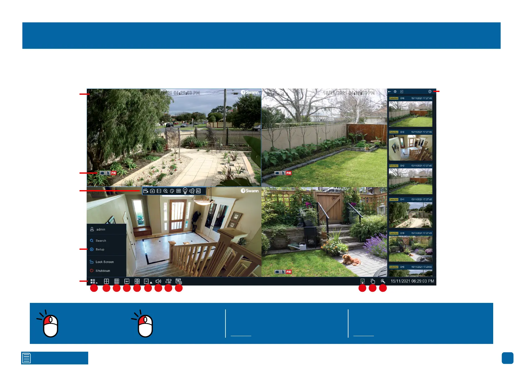 Live View mode is the default display for your NVR. Connected cameras will be displayed here (multiple view modes available). You can check the operation of