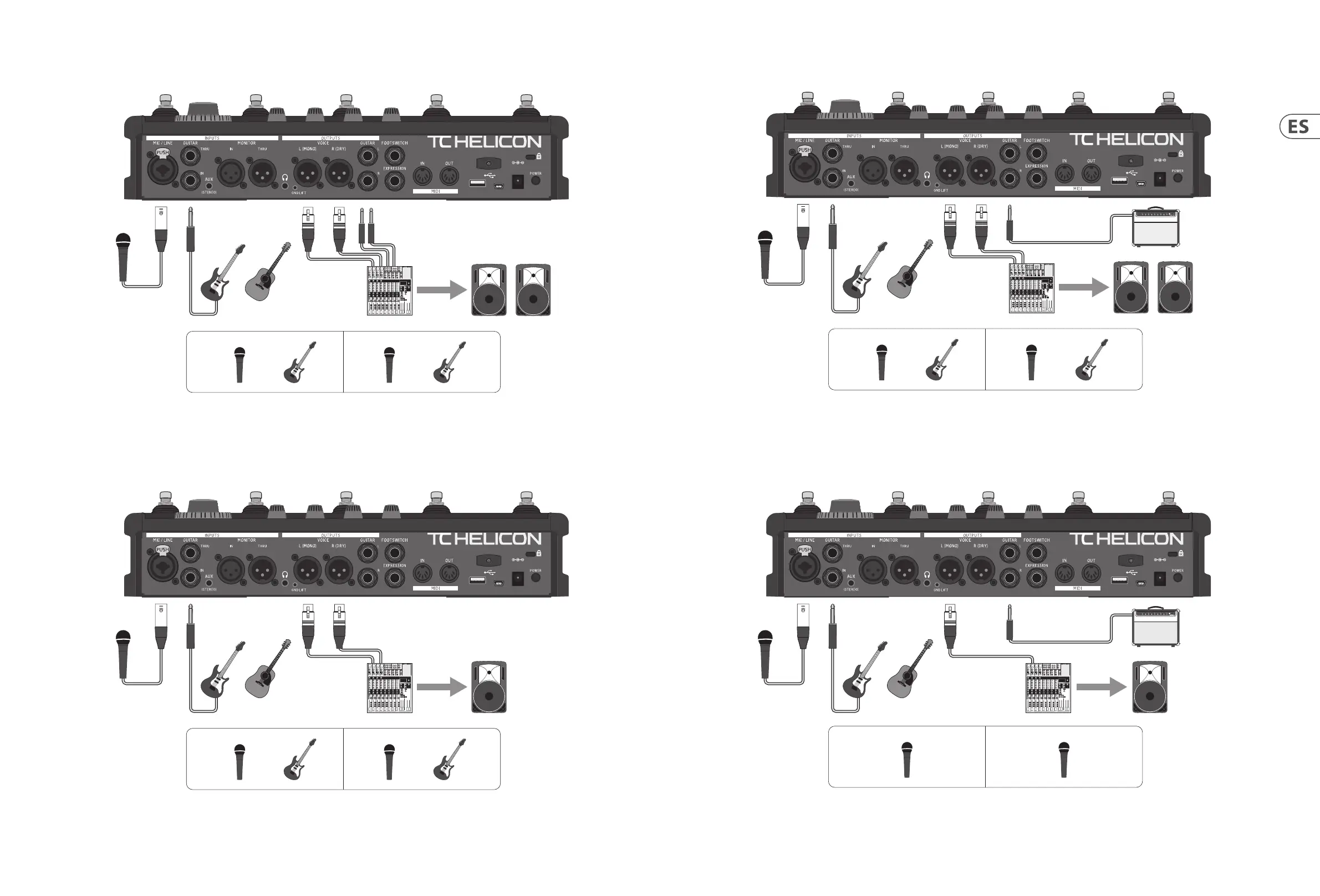 VOICELIVE 3 cuenta con "detección de jack" en varias entradas y salidas. Con esta conguración de conexión, todas las señales de guitarra se eliminan de la ruta de