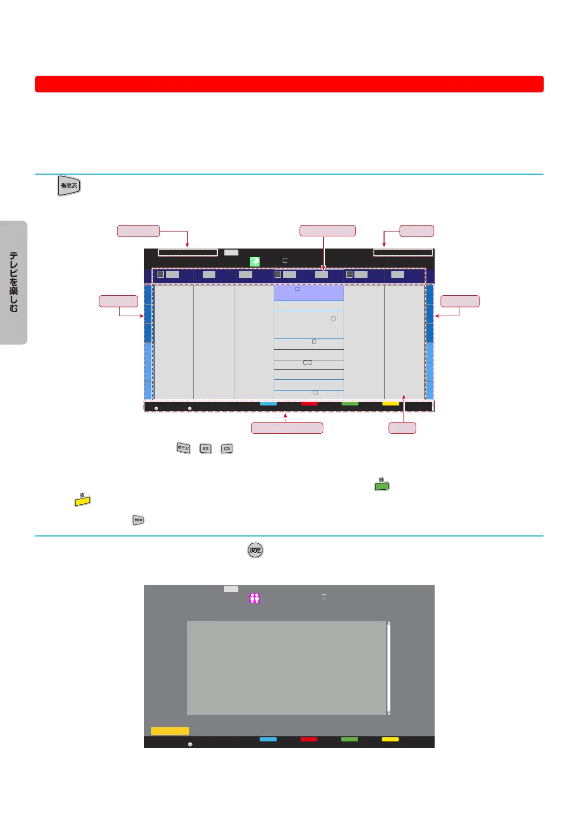 ● 番組リストは、当日から 8 日間分表示されます。前日の番組表を表示するには● ●を押し、翌日の番組表を表示するに