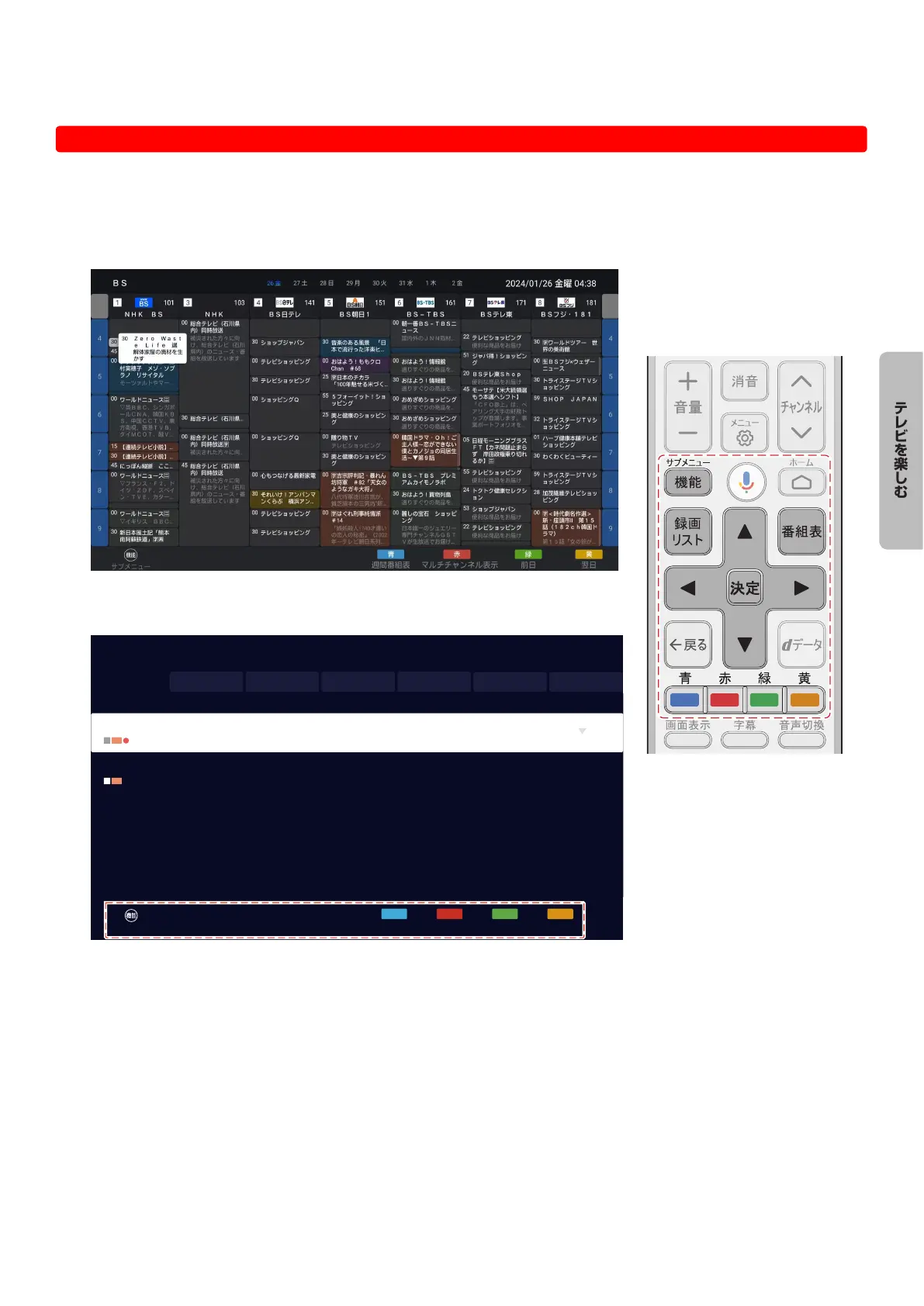 ●● 番組表などのメニュー画面の下部には、そのときに使用できる(または使用する)リモコンボタンの操作ガイドが表示され
